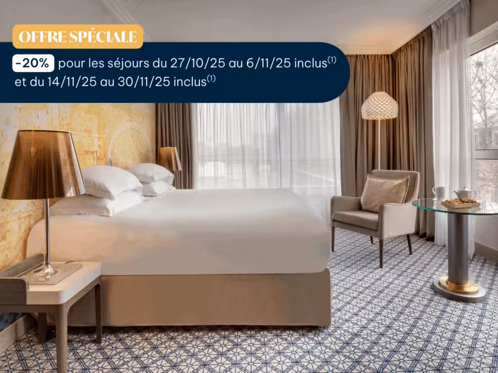 (1)Offre valable du 27/10/25 au 06/11/25 inclus et du 14/11/25 au 30/11/25 inclus, non cumulable avec d’autres offres en cours, non annulable, non remboursable, sous réserve de disponibilités. Offre qui n’inclut pas le petit-déjeuner et la taxe de séjour. Pour toute réservation de chambre uniquement (hors soins, hors restauration, hors taxe de séjour) du 13/10/25 au 29/11/25 inclus.